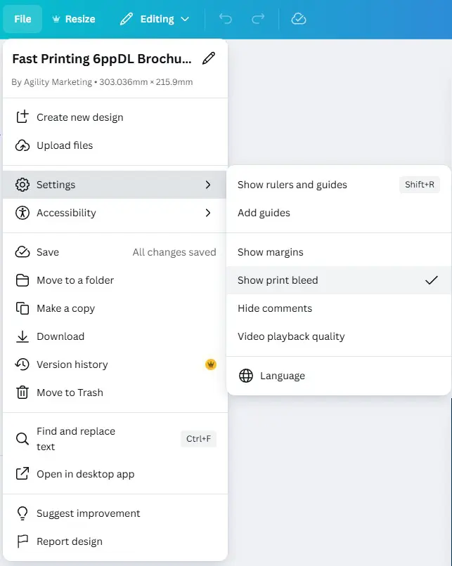 - Select Show print bleed. A dotted line will appear, marking the edge of the final design area. Ensure all background images and colours extend beyond this line.